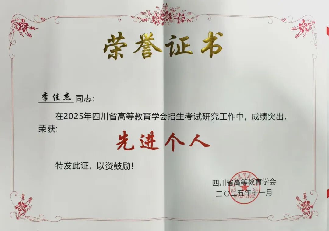 在此次会议上,专业委员会对年度贡献突出的集体与个人予以了隆重表彰,我校荣获“四川省招生考试研究工作先进集体”称号,李佳杰同志荣获“先进个人”称号。